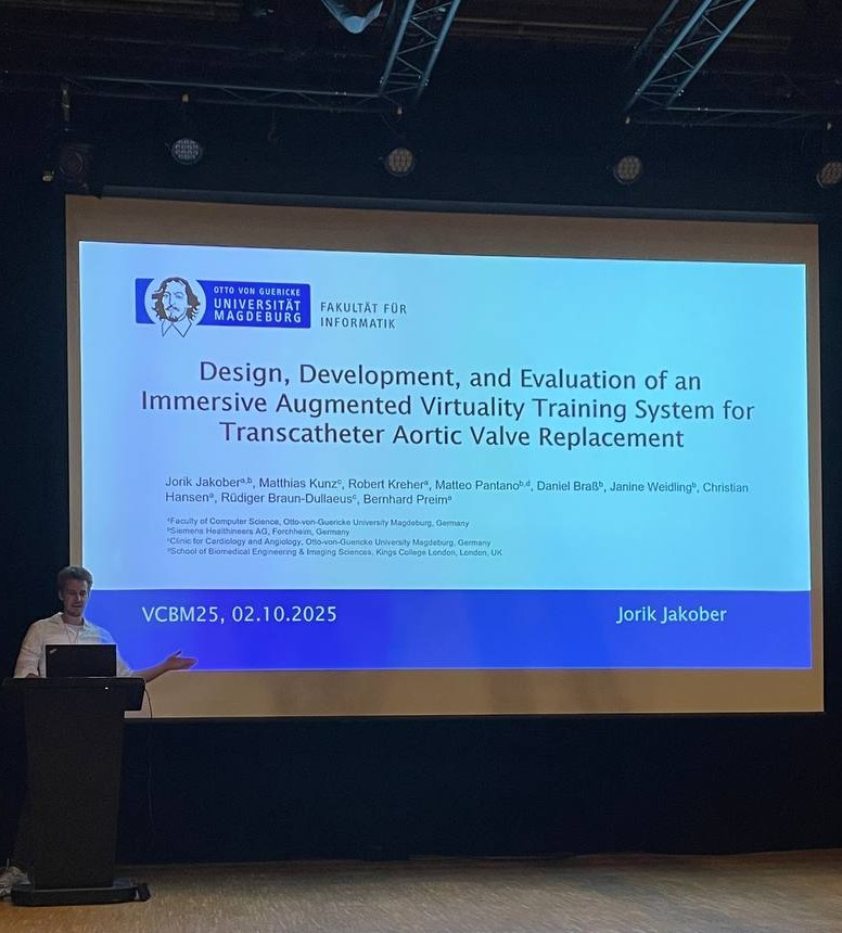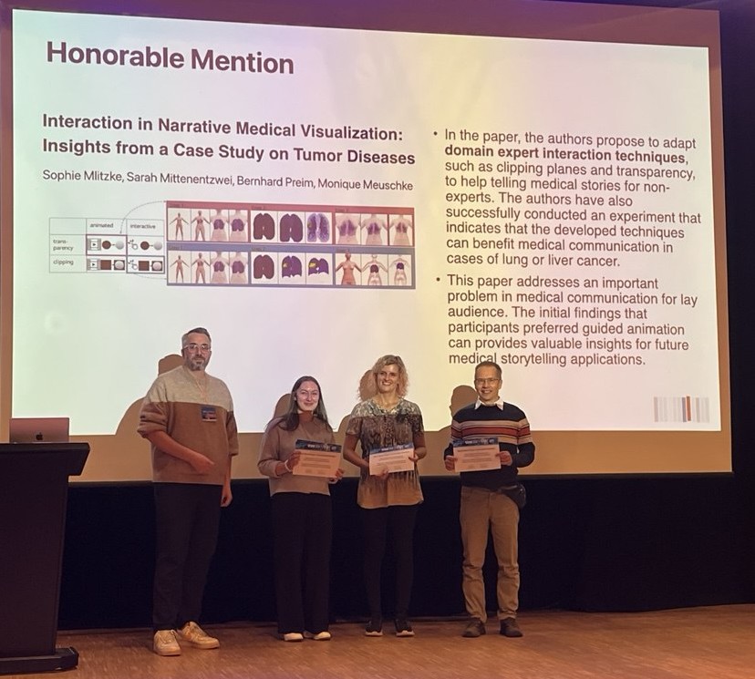 Our contribution „Visual Disease Stories: Empowering Health Literacy and Promotion“ with Sarah Mittenentzwei as first author received the first price in the bi-annual competition for the Dirk Bartz Price of the Eurographics. The price was awarded on the EuroVis, June 2025. Further contributors are Sophie Mlitzke, Beatrice Budich, Anna Kleinau, Monique Meuschke and Bernhard Preim. The price acknowledges several contributions on narrative medical visualization informing in an engaging manner about diseases, their prevention, early detection, diagnosis and treatment.